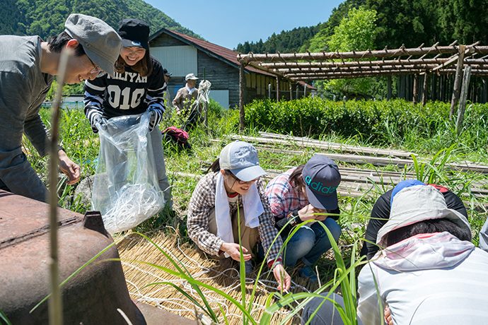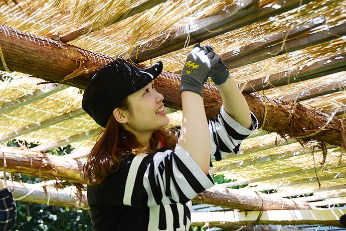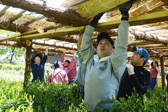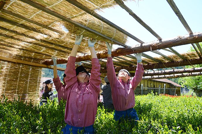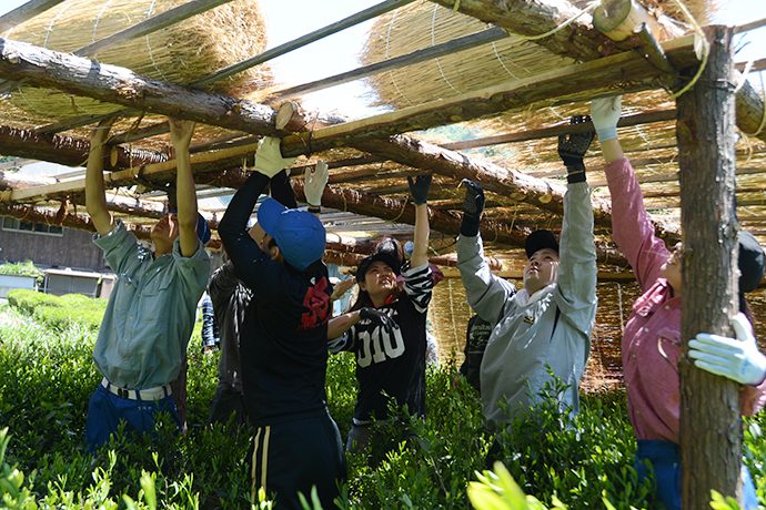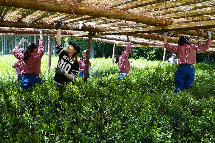 茶畑の一角では、地元東近江市の八日市南高校の生徒さんが作業をされていました。お話を聞くと、「玉露をつくるために、茶葉にこもをかけます」とのこと。詳しく教えてもらいながら、お手伝いさせていただくことにしました。
