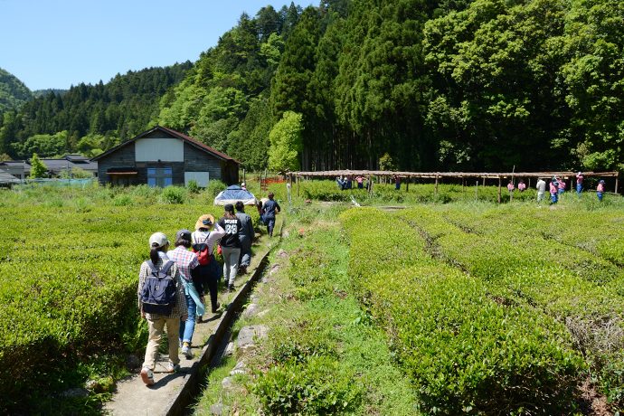 政所に到着すると、さっそく山形さんが茶畑(山形さんは“ちゃばた”と呼んでいました!)へ連れて行ってくれました。民家の間の小道を抜けると、鮮やかなグリーンが見えてきました。