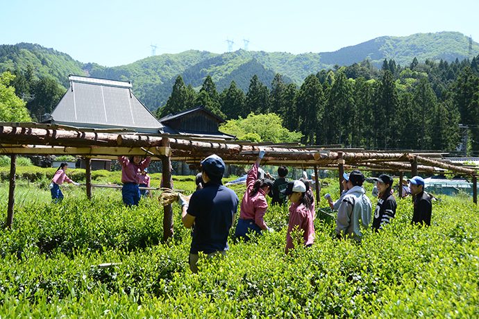 玉露とは日本茶・煎茶の一種で、日光を遮ることで茶葉に含まれるテアニンという成分を増やし、旨みの強いのが特徴。以前は政所地区でもつくられていましたが、より手間と労力がかかる玉露生産は数年前に途絶えたといいます。そこで、今回復活に向け、高校生のみなさんが奮闘されていました。