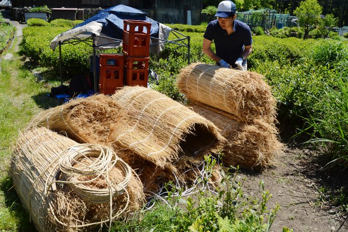 今回かぶせる「こも」は、藁(わら)を手編みした昔ながらのもので、生徒のみなさんが約2年をかけて約100メートルを編み上げたそうです。市販のものを使えばこの手間はかからないのでは?と思われるかもしれませんが、この「こもを編む技術」さえも今では途絶えようとしている大切な技なのです。