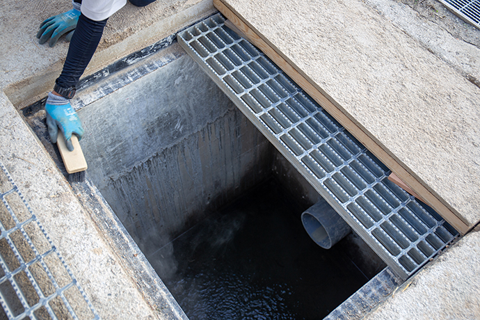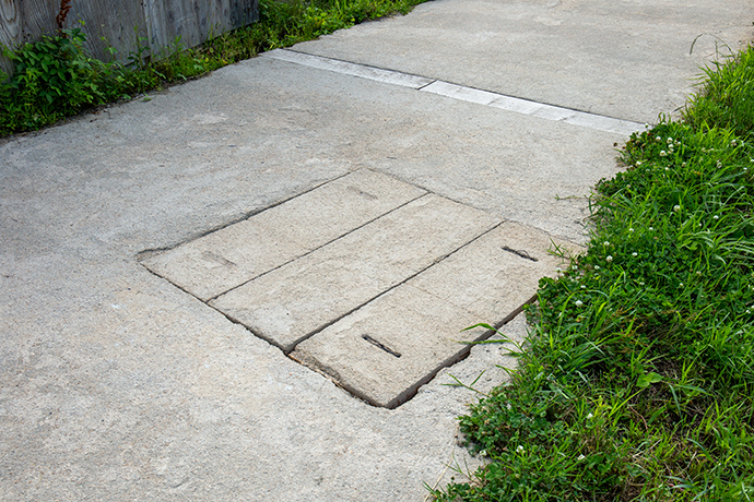 新店舗「(仮称)バームファクトリー」建設に伴う園路拡張工事により、今まで田んぼ沿いの草で隠れていたこの排水桝(はいすいます)が、園路上に出てきました。