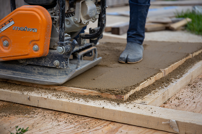 手作りの木枠の中に、真砂土(まさど)など、園路造りで使用した同じ材料を入れ、押し固めます。