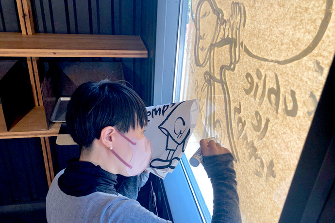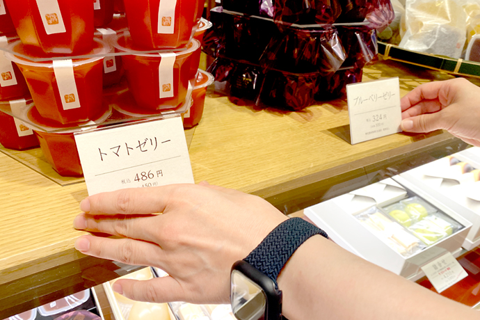 私は今、値札やPOPなど販売促進のツールを作ったり、店頭での商品展示を考える部署に所属していて、学生時代と前職での経験も活かし、お菓子を「作る」「売る」以外の「伝える」仕事に携わっています。