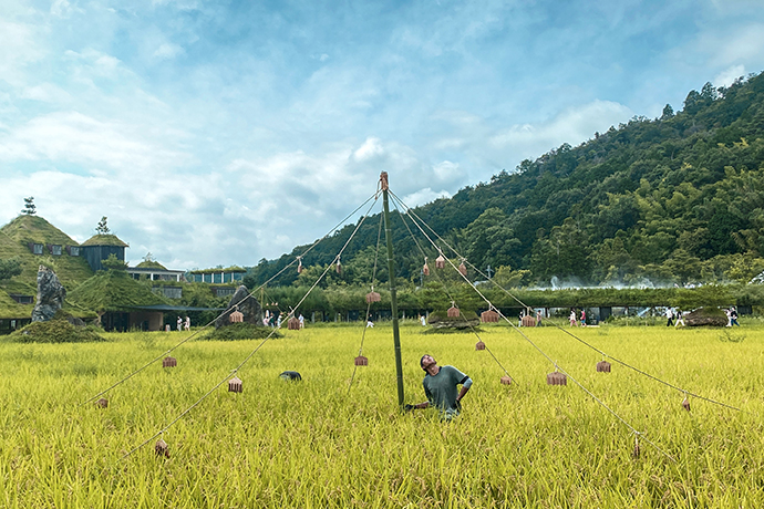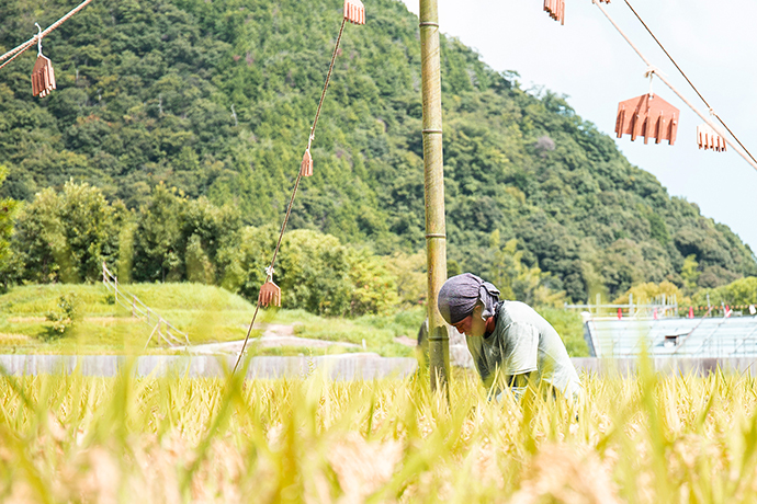それをなるべく防ぐために、ラ コリーナの田んぼでは「鳴子」を設置しています。