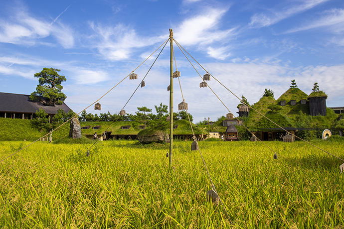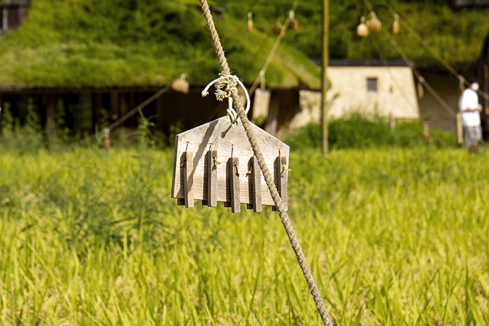 鳴子は、木の板に数本の木片を糸で吊り下げたもので、風が吹くと音がなり、その音でスズメを脅して追い払う昔から伝えられてきた農具です。