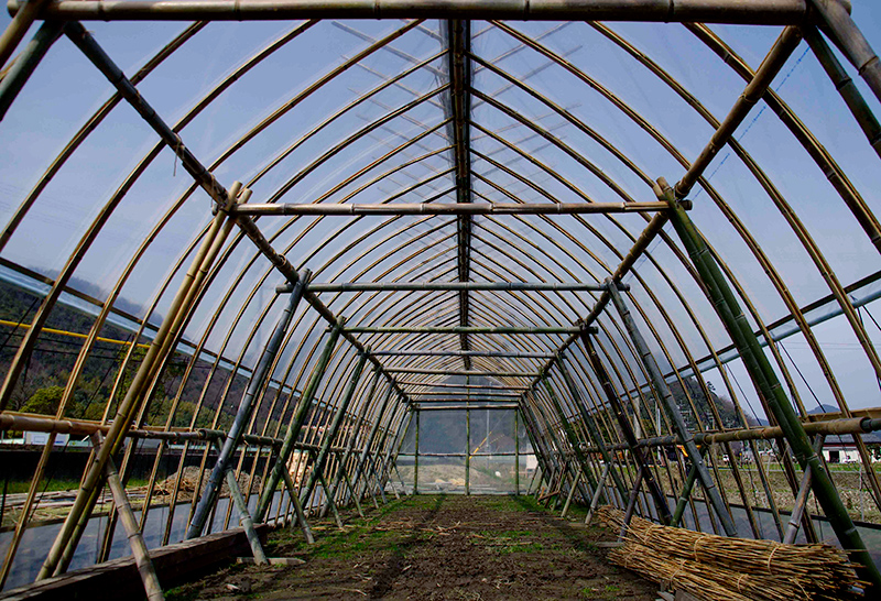 | 小林 | そういうのもあって、地域に根ざす建築とはどのようなものか模索していたのですが、たまたま京都市内で空き地の有効利用に都市型農作物栽培を提案している農学部の先生がいて、それには栽培管理上、農業用ハウスが必要ということで、その上屋を君、デザインしてくれと言われまして。経験はなかったのですが、竹でつくりませんかとその場で提案しました。 |