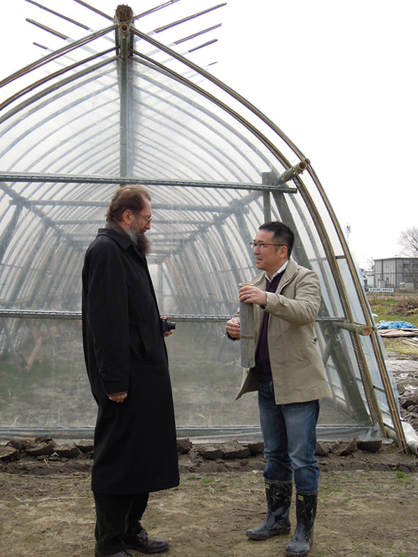 | 小林 | そんなある日、百菜劇場の建設が終わって、たまたま手直しのために現場にいたところ、黒い服を着た人たちが沢山こちらにやってきたんですよ。うわ、なんだろうって思っていたら、「ルッキさんです」「えーっ!」という感じで舞い上がった状況でバンブーグリーンハウスの説明をしました。ただ、あちらは私のことを完全に農業関係者だと勘違いしていて、「農夫よ、君はなかなかいいセンスだね」みたいなことを言われたりしまして(笑)。 |