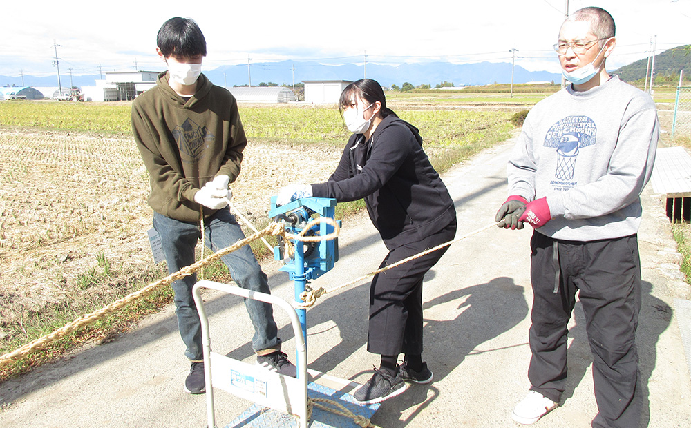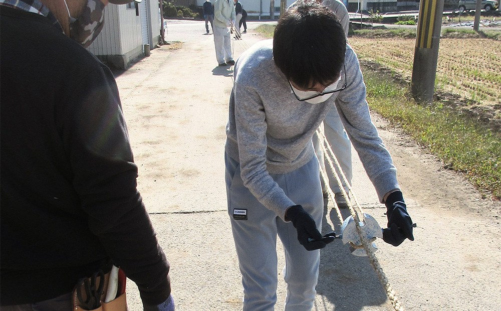 更に、制作の2週間ほど前にはヴォーリズ学園の学生さんが南津田町のみなさんに曳(ひ)きずり松明に使う「みがき縄」の作り方を教えていただきました。みがき縄は3本の縄に撚(よ)りをかけて作ります。