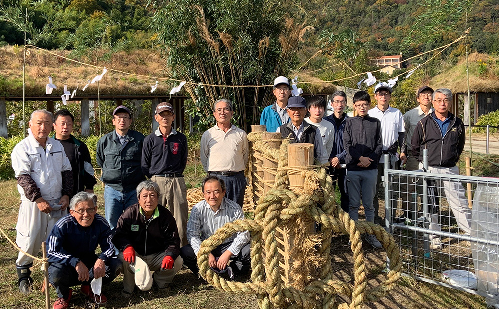 「たいまつ展示」の当日、贈る会のみなさんのご指導の下、全員で掛け声を出し大きな松明を結い上げます。