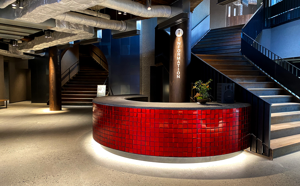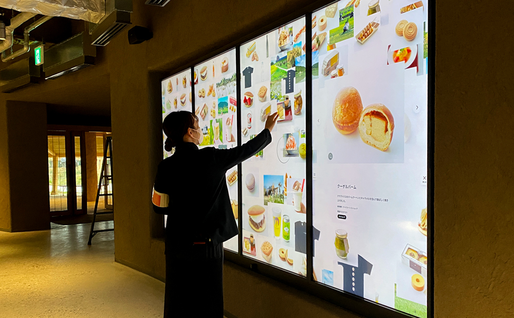 赤いタイルが目印のインフォメーションカウンターに、ラ コリーナの店舗やお菓子をご案内するデジタルサイネージ。