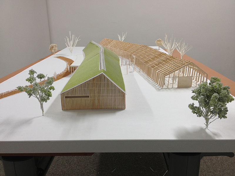 | 小林 | 最初はそんな始まりだったんですが、その後、設計条件をいただき、結構大きな施設であることがわかってきました。ですが、建設する敷地を見たり建物内での活動内容を聞く中で一貫していたのは、なるべくヒューマンスケールに抑えた施設のイメージでした。敷地になじみ自然と一体化するようなイメージです。 |