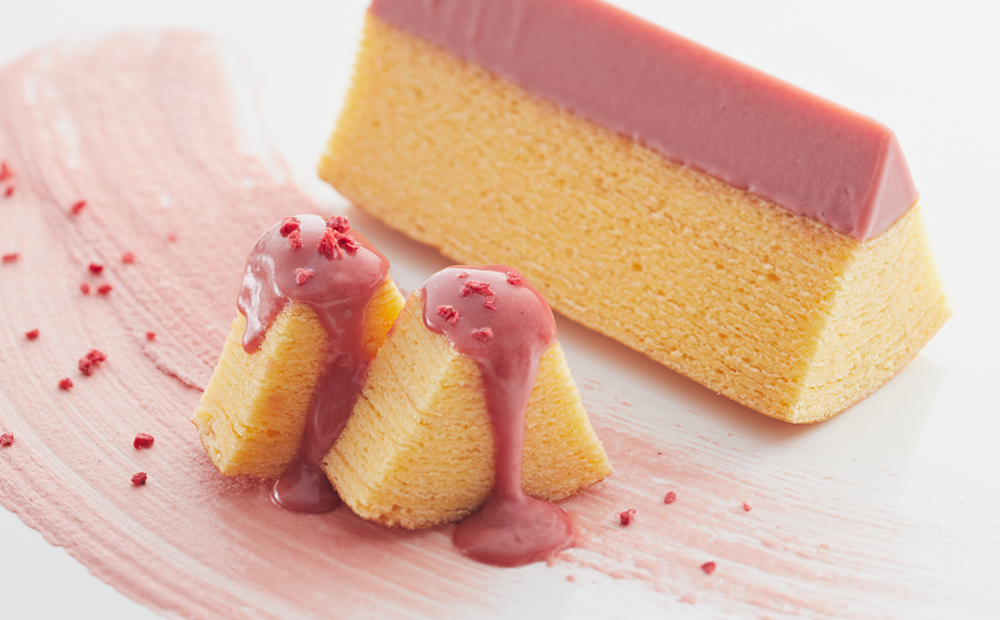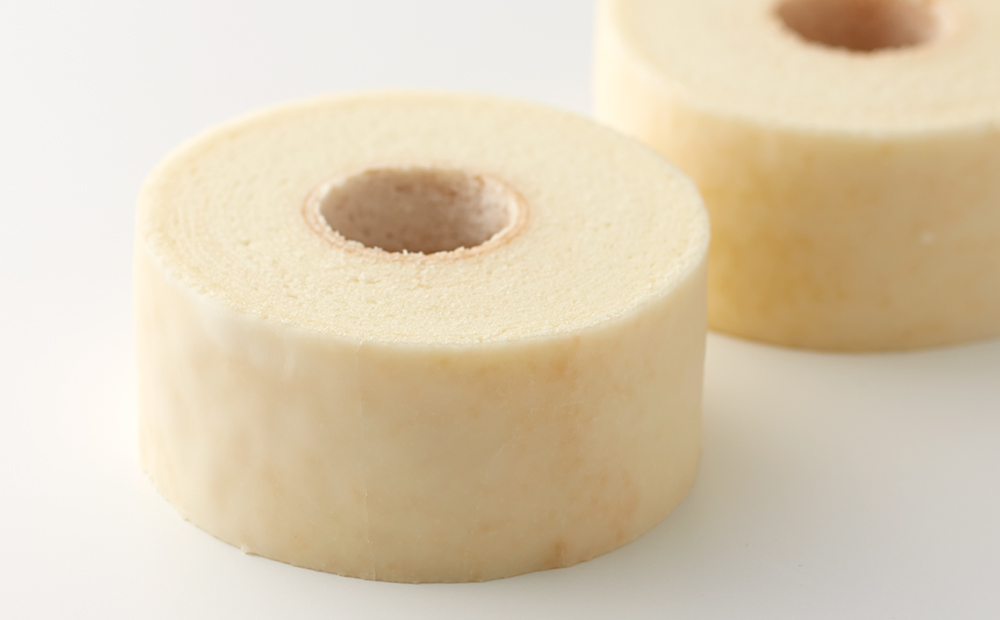 バームクーヘンに苺のガナッシュをあわせました。お召し上がりの前に温めることでガナッシュが溶け、生地もふっくらやわらかに。