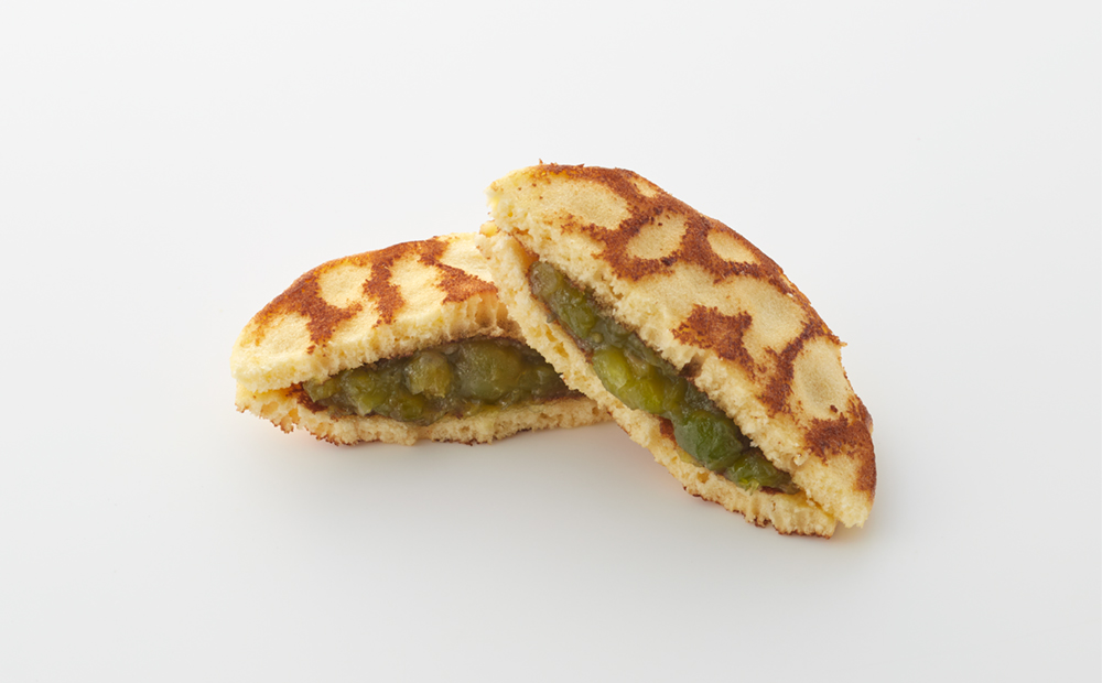 とら模様の生地に、北海道産の青えんどうをやわらかく炊きあげた餡をはさみました。
