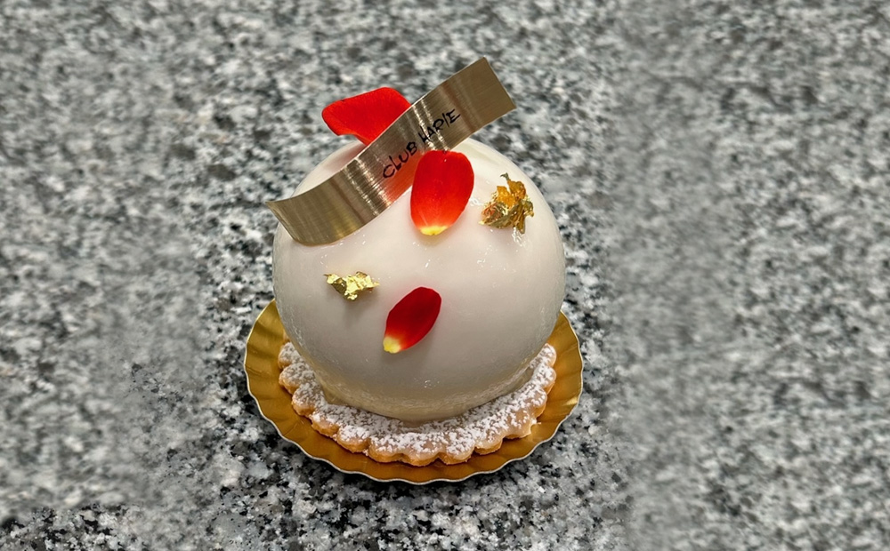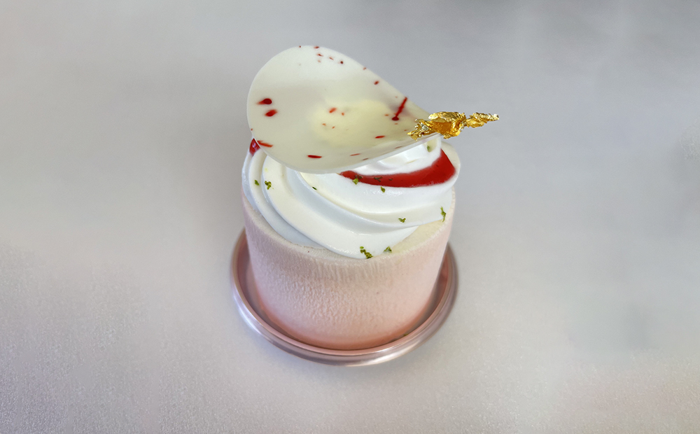 エレガントなバラをまとったようなマダムをイメージしてケーキを作りました。派手な色合いではなく、どことなくシックで華やかな白と赤を基調にそれぞれ違うテクスチャーのパーツで構成し、それでいて一体感のあるまとまりに仕上げ、ベリーの中にふんわり香るローズのパルファム、甘さの中に酸味とオレンジの苦みと香りを閉じ込めました。グラサージュも極力、味に干渉しないようにシンプルに且つ光沢の出る様に配合や温度に気を付けました。