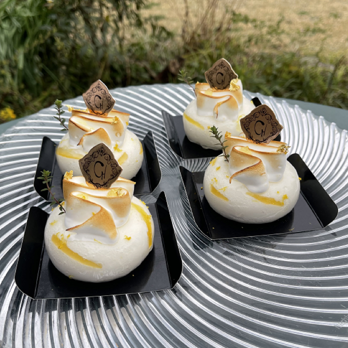 初夏を感じられる日向夏を使用し、さっぱりと食べられるケーキをイメージして作りました。ムース・コンフィ・ゼストなど、日向夏をまるまる使用しています。とくにコンフィは、種以外の皮・実・ワタ・薄皮など日向夏の全てを余すことなく使っています。日向夏のみだと酸味が弱かったのでレモンと併用し、味に厚みを出すためにセンターにムースリーヌを入れています。生地にはたっぷりシロップとコンフィを塗っています。