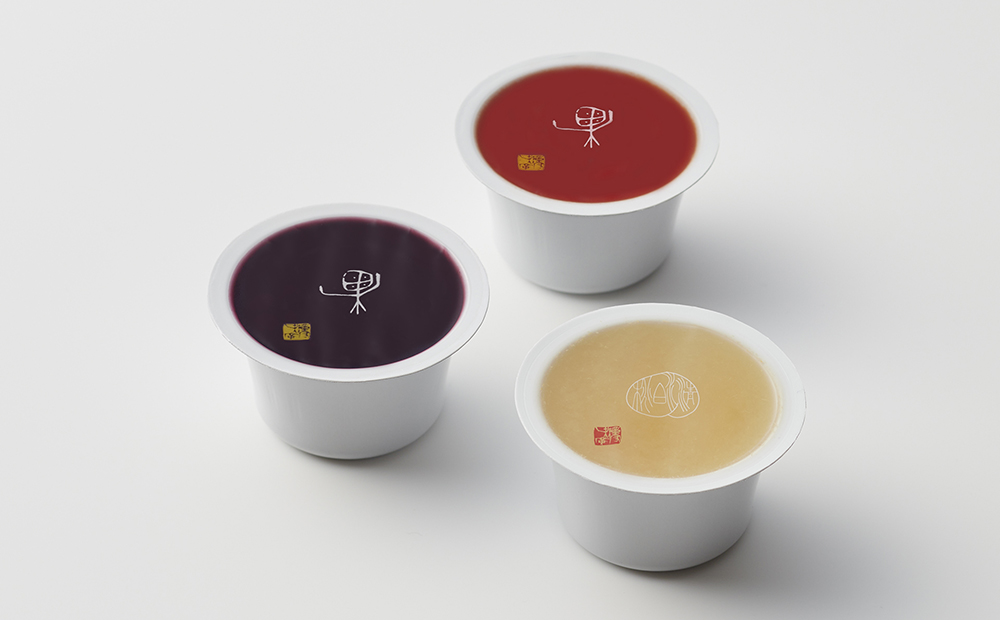 長年、夏の商品として親しまれてきたゼリーは中身が見えるプラスチック容器で販売をしてきましたが、今回は3種類統一のまるいアルミ容器でお届けします。
