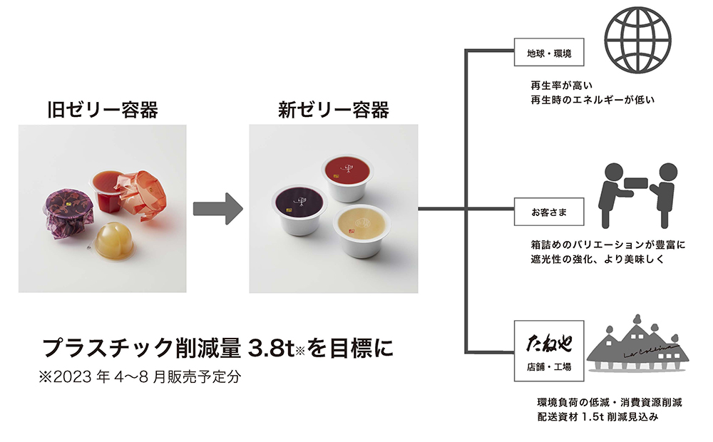 たねやでは昨年容器を変更した「本⽣⽺羹」にくわえ、「トマトゼリー」「ブルーベリーゼリー」「清⽔⽩桃ゼリー」の容器変更でプラスチック削減量3.8tを⽬指します。