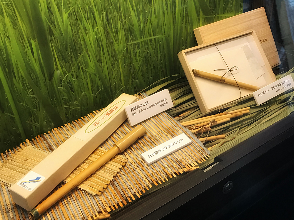 ▲琵琶湖よし笛やヨシ編みランチョンマット
