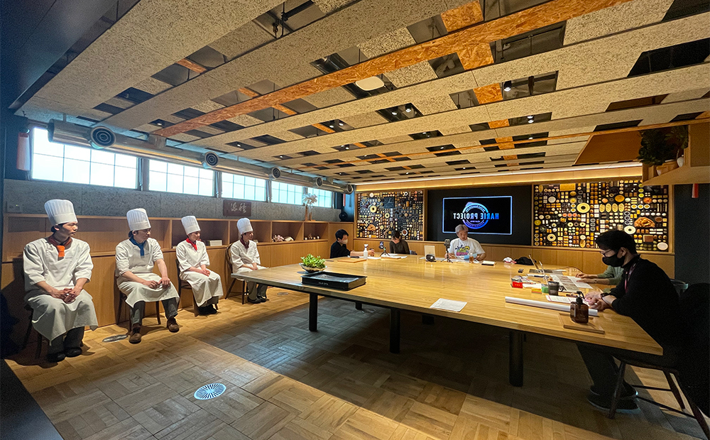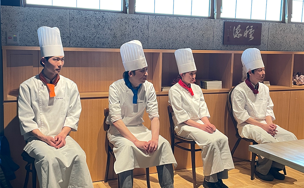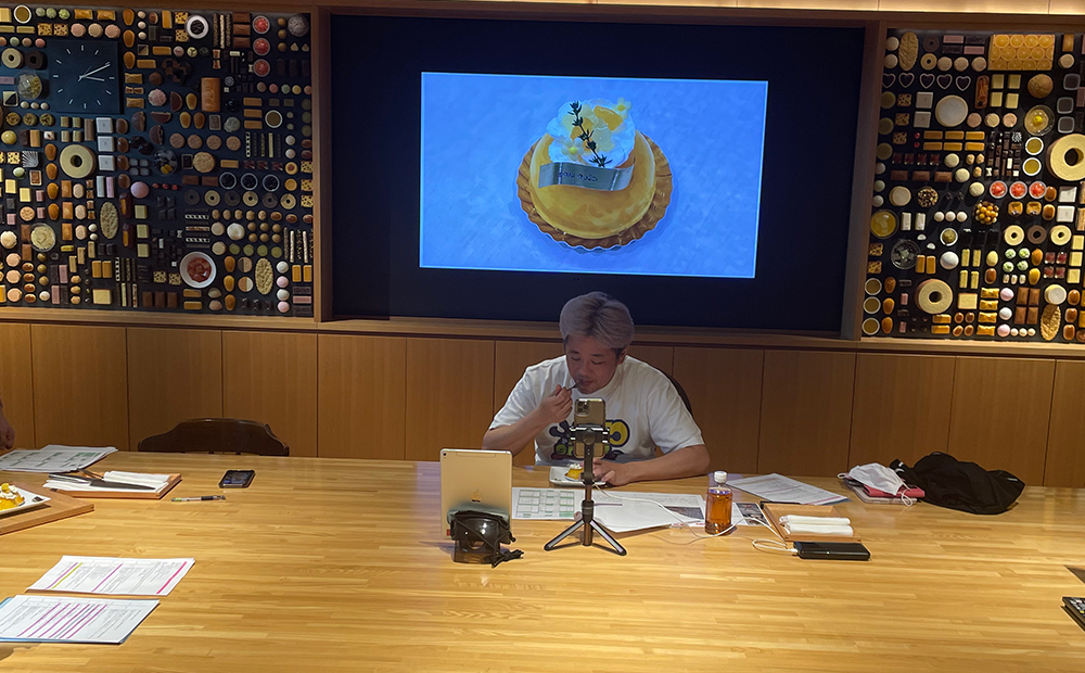 各スタッフの紹介後、審査中は別室で待機します。審査員のグランシェフは、4つの作品を順不同で試食し、どのケーキが誰の作品か分からないよう審査を行い評価をしていきます。