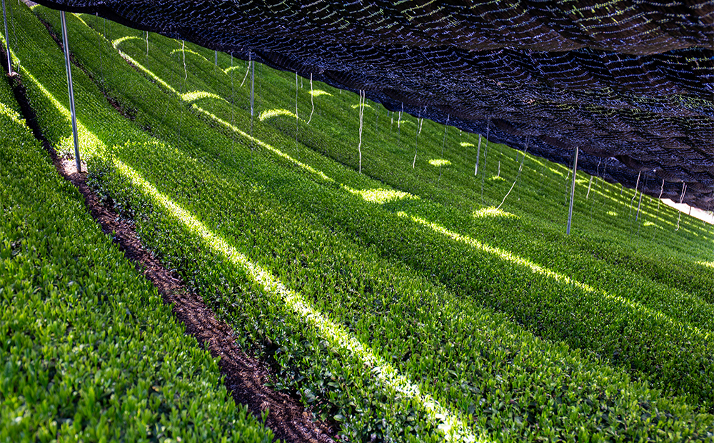 新芽の生育中、一定期間光を遮って育てる方法のことを被覆(ひふく)栽培といいます。光を遮ることで、露天で栽培される煎茶にはない、鮮緑色と独特の芳香、まろやかな旨味や甘味のある茶になります。手間ひまかけて良質な茶を作り出すための技法です。
