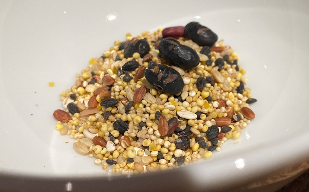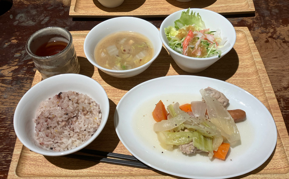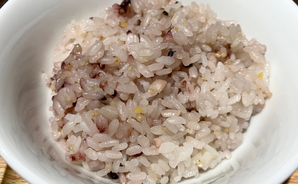 まかない食堂ではそこで収穫した白米にはと麦や赤米、黒豆などを混ぜた雑穀米が主食です。