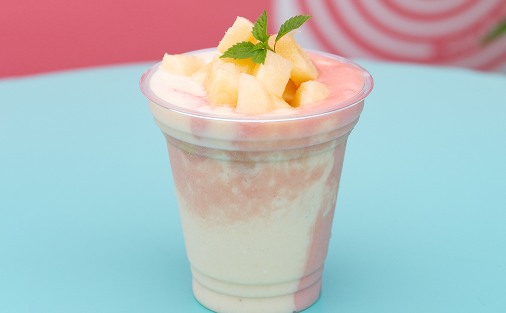 清水白桃をまるごと1個使った贅沢なドリンク。スムージーの中には白桃のソルベ、上には清水白桃のコンポートをたっぷりのせています。
