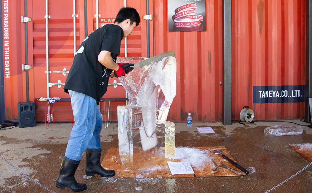 総勢12名が参加し、電動工具あり・なしのそれぞれの部門で競技時間内に、氷のもつ特質・美しさを造形することにより芸術的美を表現し技を競います。