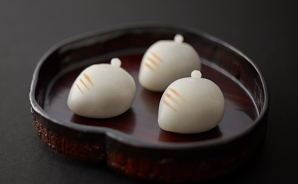 秋のみのりに感謝し、月に供えた里芋にちなむ「きぬかつぎ」。お菓子に添えたお団子の粒は、里芋を掘り出したときについてくる小さな孫芋をあらわしています。