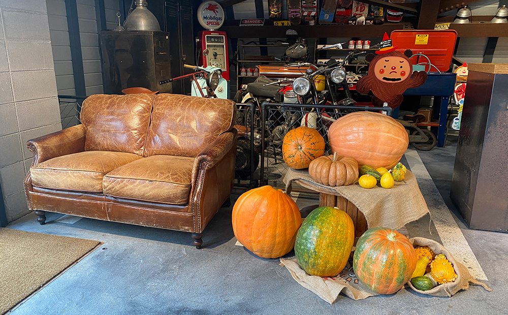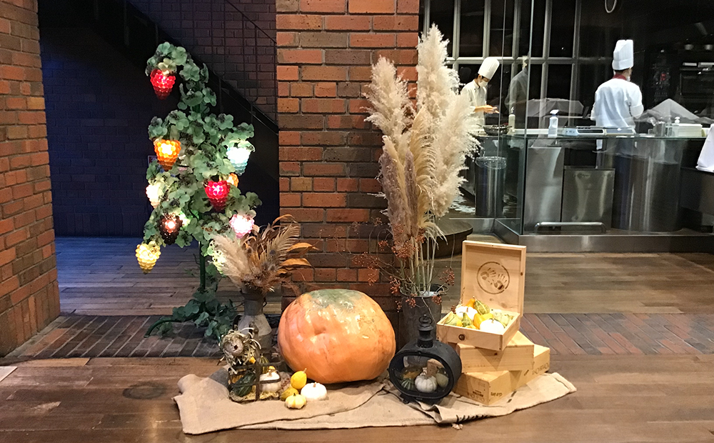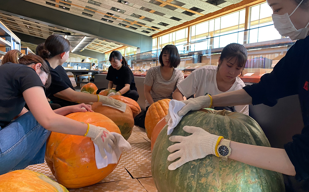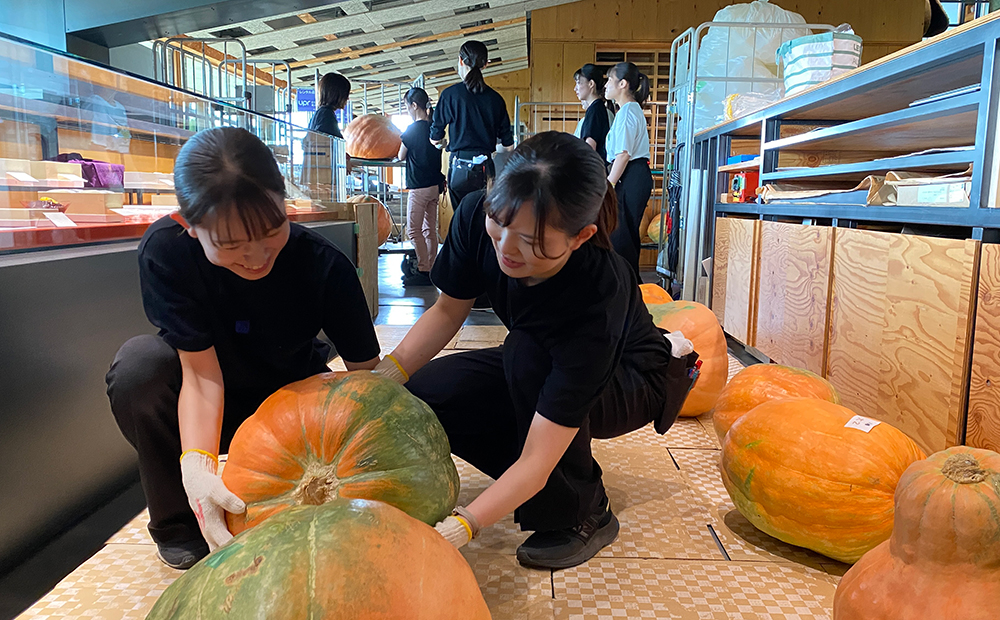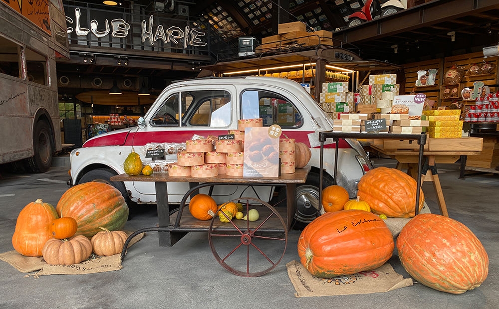 たねや・クラブハリエでは、ご来店されるお客さまにできる限り自然のもので季節を感じて欲しいという想いから、ハロウィンを盛り上げるため店舗に本物のかぼちゃをディスプレイします。
