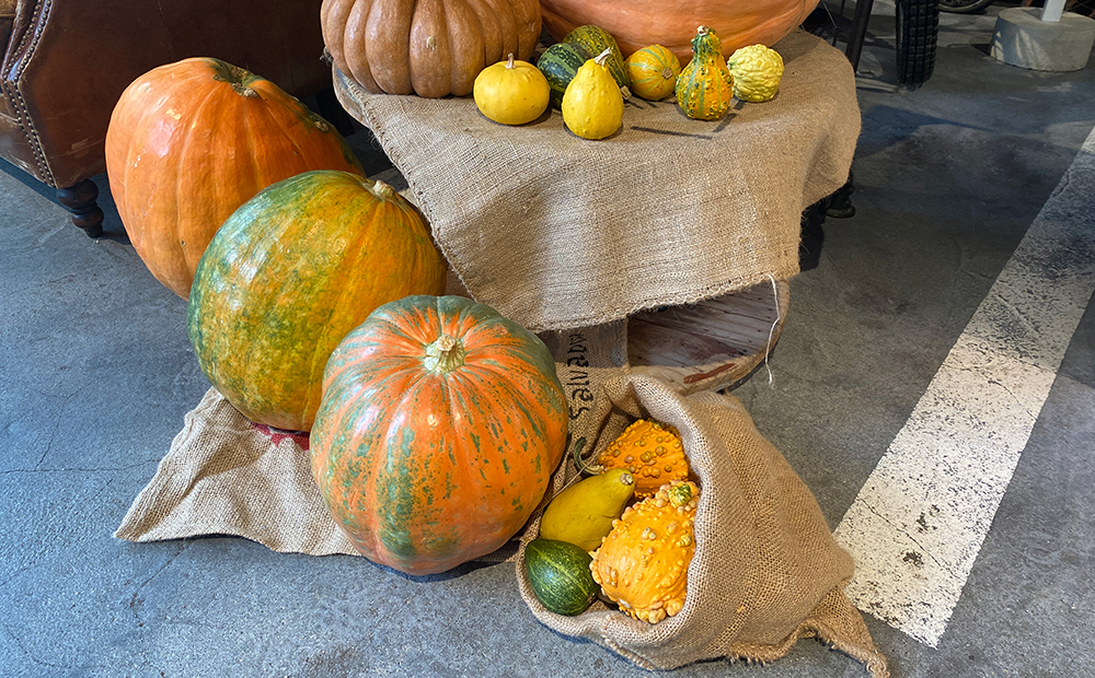 また、捨てられるはずだったコーヒー豆の入っていた麻袋を譲り受け、かぼちゃを引き立てるディスプレイとして再利用しています。