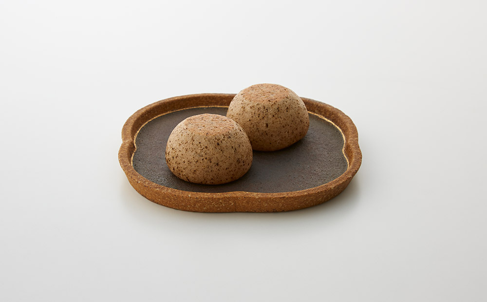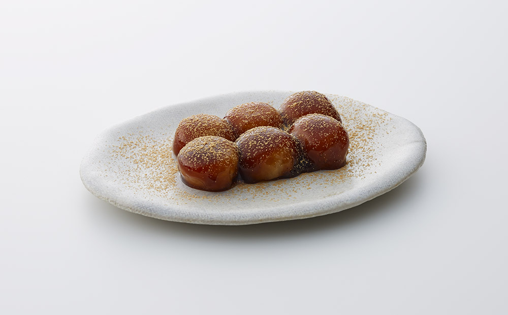 近江米の粗搗き餅を丸く仕上げ、葛入りの黒蜜をたっぷりかけました。黒糖の香りもゆたかに、香ばしいきな粉をかけてお召し上がりいただく素朴なお餅です。