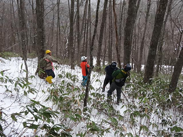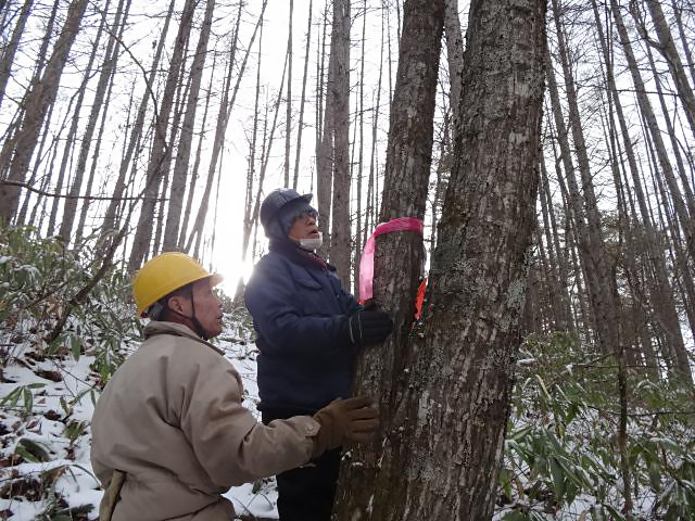 断崖絶壁の雪山も物ともせず、一本一本、木を選定していかれます。曲がっていたり、分かれていたり、のびのび育った木が先生好み。「面白いねぇ」「いいですねぇ」と、まるで山遊びをするかのように、楽しくビビビッ!と選んでいかれます。その数、ゆうに100本超!