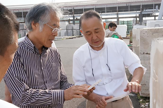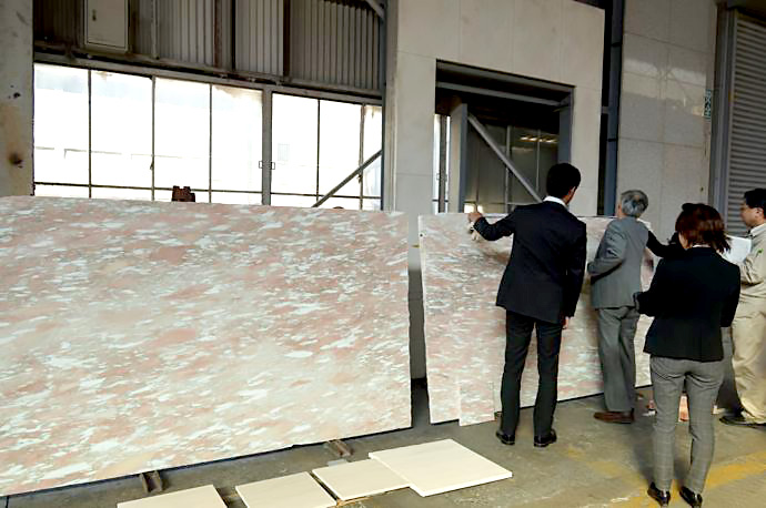 石も大切な仕上げ材。何度も石材店に足を運び、世界の石を見せてもらいます。産地や磨き方で多様な表情をみせる大理石。地球のかけらとも言える石を、どう建物に活かすか。先生の目利きが続きます。