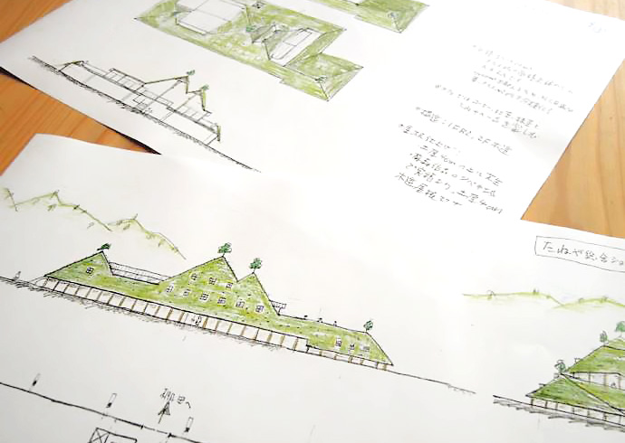 以前より親交のあった藤森先生。これから先、何年もかけて営みを繰り広げるこの地に、ゲートとなる和洋菓子の総合ショップをつくりたいと投げかけたところ、なんとも刺激的なスケッチが届きました。