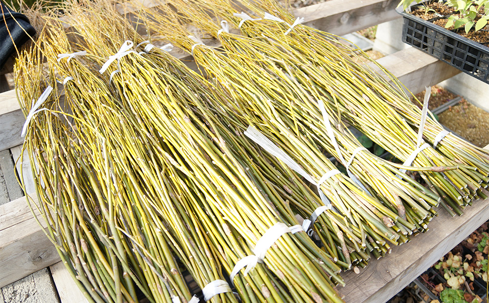 柳が生えていた場所によって枝の長さや硬さに違いがあり、自社農園キャンディーファームのスタッフが一本一本見極めながら剪定していました。