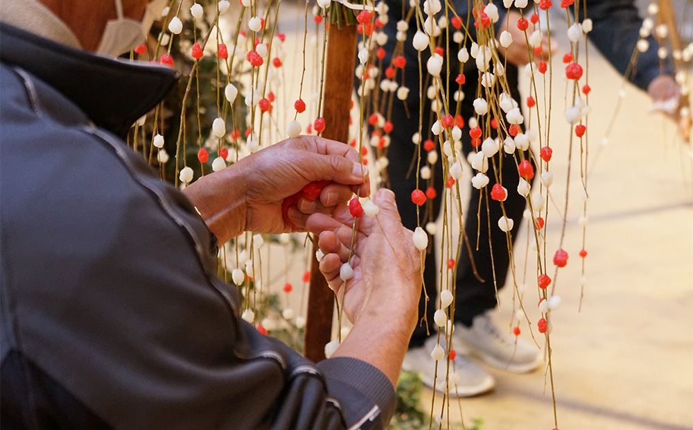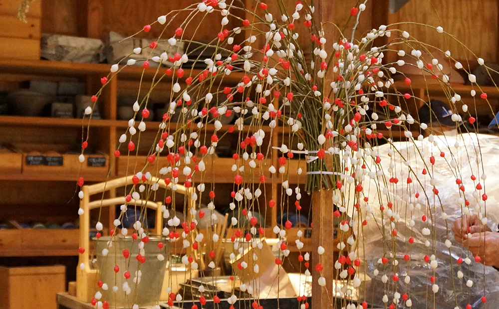 餅花とは日本各地に伝わる木の枝(主に柳)に餅や団子を小さく丸めて付けた伝統的な飾り物のことで、豊作や幸福を祈願する行事のひとつ。