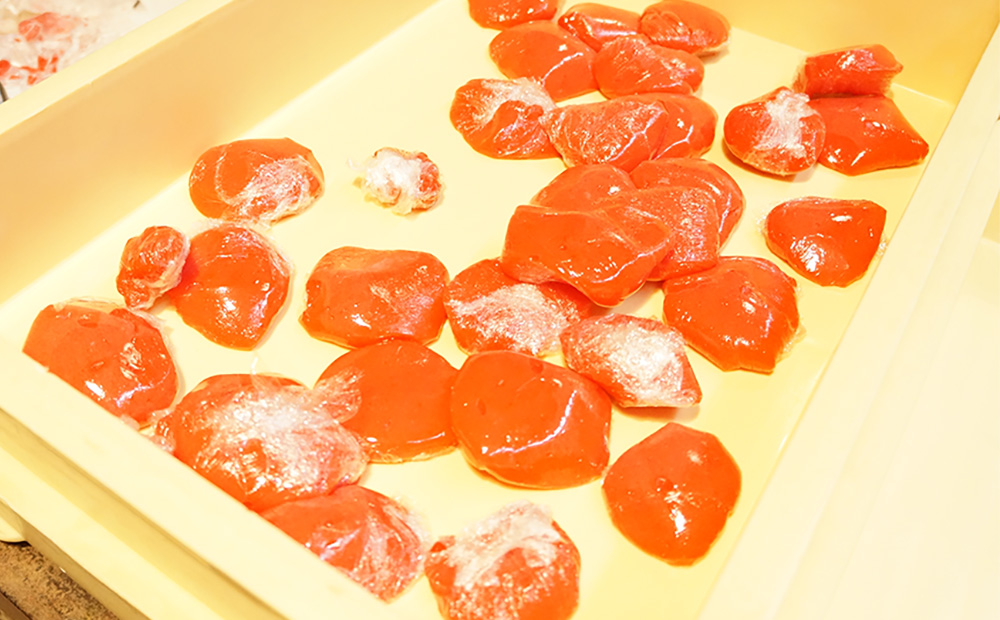 餅をつける際に幅が均等にならないよう不規則につけて、餅が紅白あわせて4個(縁起が悪いとされている)にならないように気を付けていると教えていただきました。