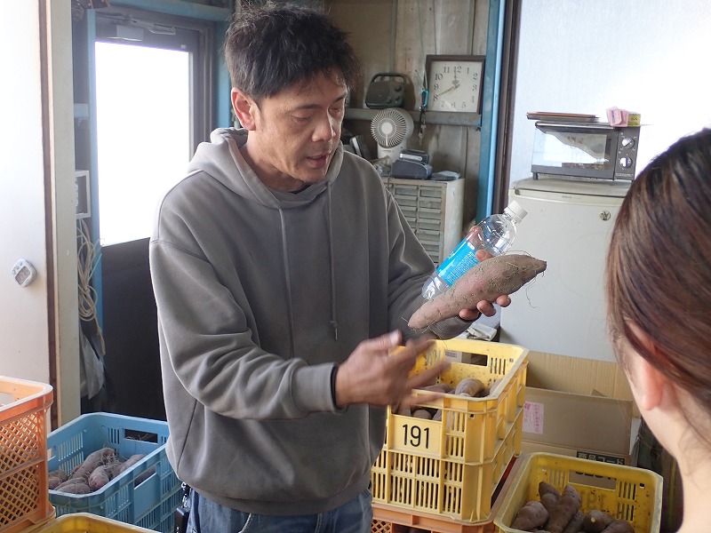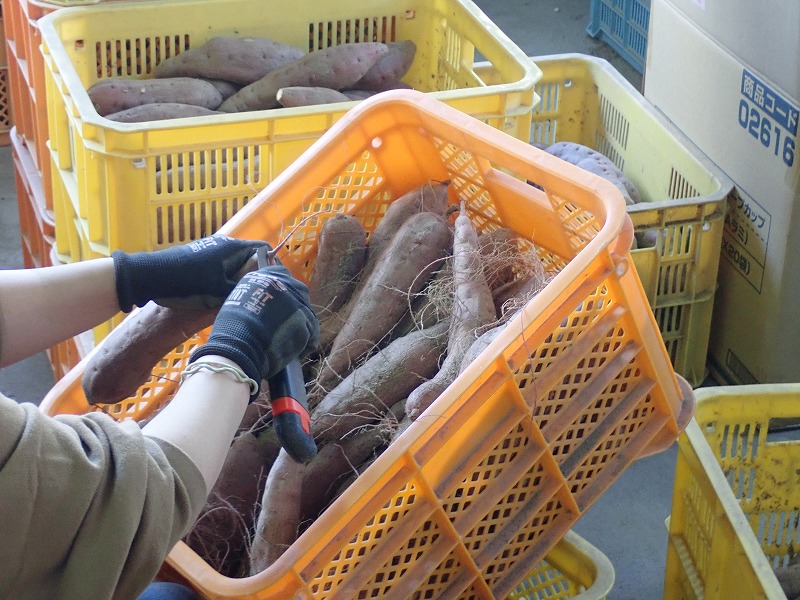 収穫したサツマイモは、サイズごとに分けながら太い根や、上下の固い部分をひとつひとつ丁寧に手作業で取り除いています。