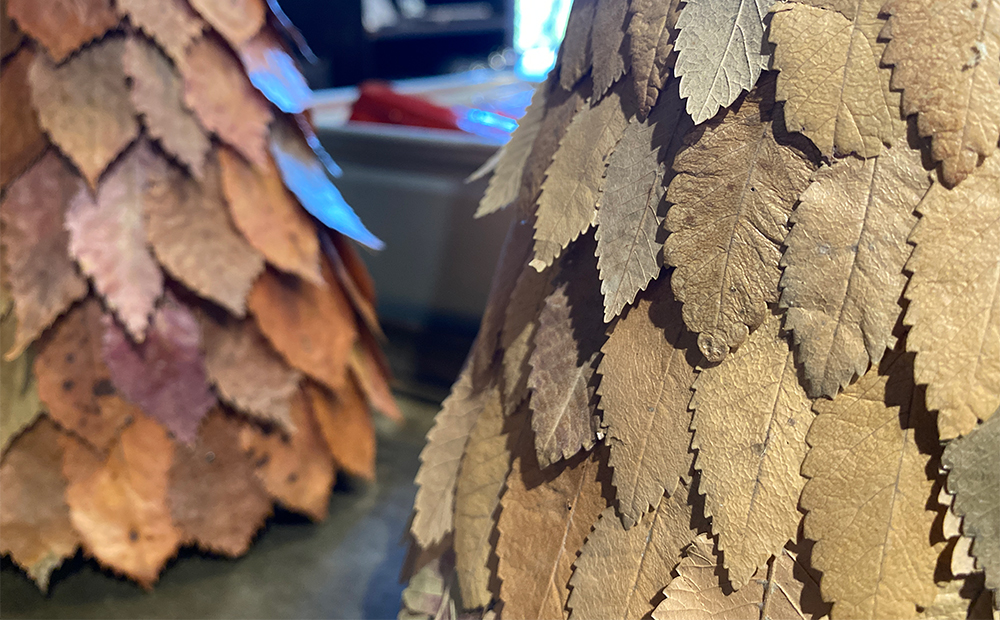 さまざまな色に染まった手作りの葉っぱツリーたち。素材は全てラ コリーナの敷地内で集めたものばかりです。自社農園キャンディーファームのスタッフが、毎年みんなでアイデアを出し合いながら制作を進めます。