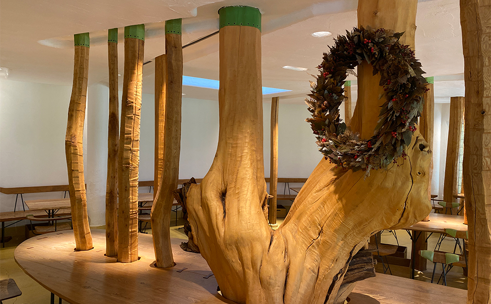 カステラショップ 栗百本は、建築家・建築史家 藤森照信先生のこだわりが詰まった店舗です。100本以上の栗の木をふんだんに使い、まるで栗林の中にいるような雰囲気を演出しています。