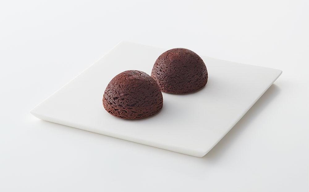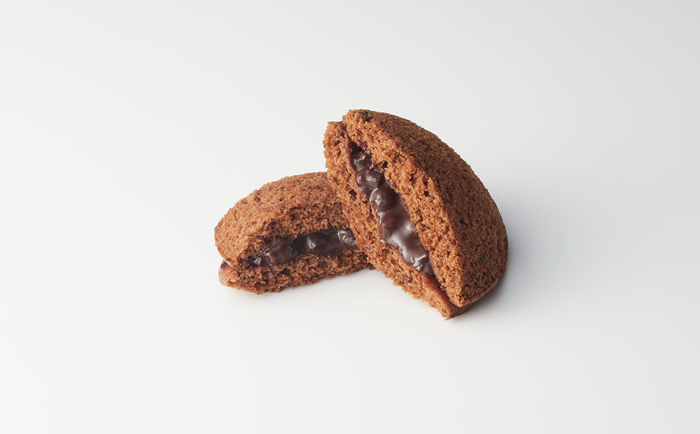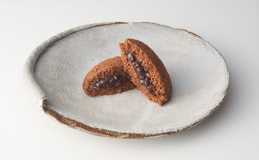 みずみずしい粒餡に濃厚なガナッシュをあわせ、ふんわり蒸しあげた生地ではさみました。生地にカカオニブをくわえることで、食感もお楽しみいただけます。