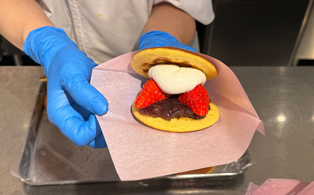 たねやのどらやきのおいしさの秘訣は、職人がその日の気温や湿度によって生地の状態を見極めながら、色よくふっくら、ふんわりと焼き上げる工程にあります。生どらは注文が入ってからひとつひとつ丁寧に仕上げるので、できたてを楽しむことができます。