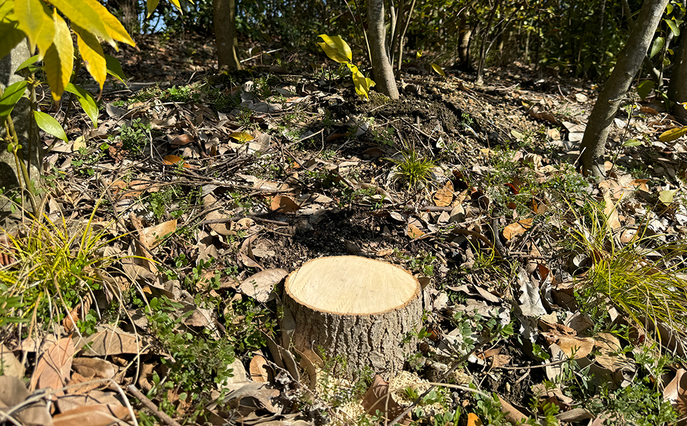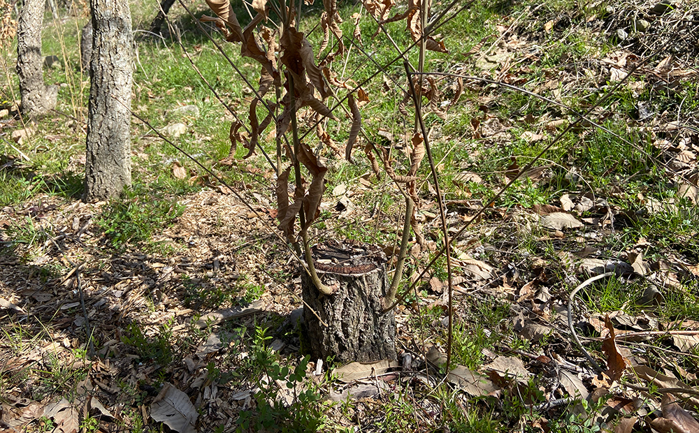 ▲ 実は、切った木は枯れてしまうことはなく、切株から新しい芽をたくさん出します。