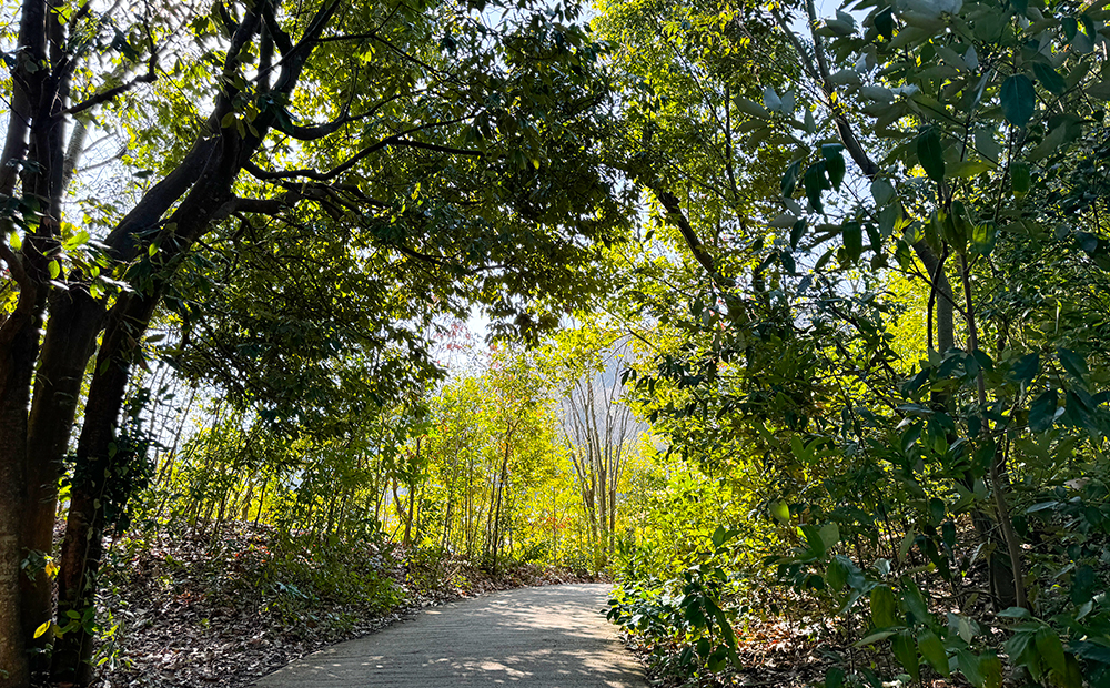 晴れの日は木々の間から光が差し込み、雨の日は葉っぱがつやつや潤っています。