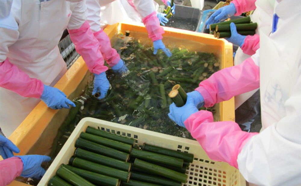 鮮やかな青竹の色を損なわないよう、冷たい水で一本一本丁寧に洗います。