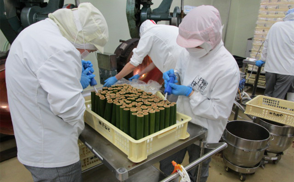 固まった羊羹を拭き取る作業が大変であるため、羊羹の温度や量に注意しながら流し入れ、きれいな竹羊羹を作るためにみんな集中して作業に取り組みました。