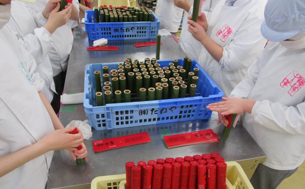 私たち製造部・物流部の2023年度新入社員17名は、左義長名物として販売する「竹羊羹」を、一から作り、自分たちの手で販売するまでを経験させていただきました。