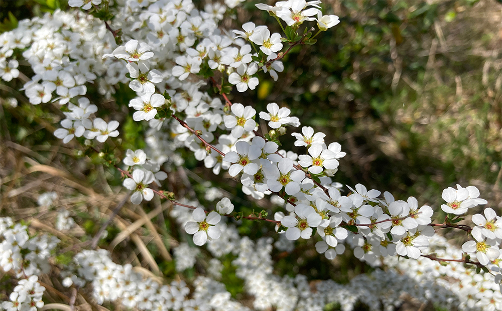 枝垂れた枝先の長い穂に、たくさんの白い花を咲かせます。その様子はまるでシダレヤナギに雪がかかっているかのようです。