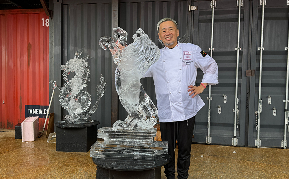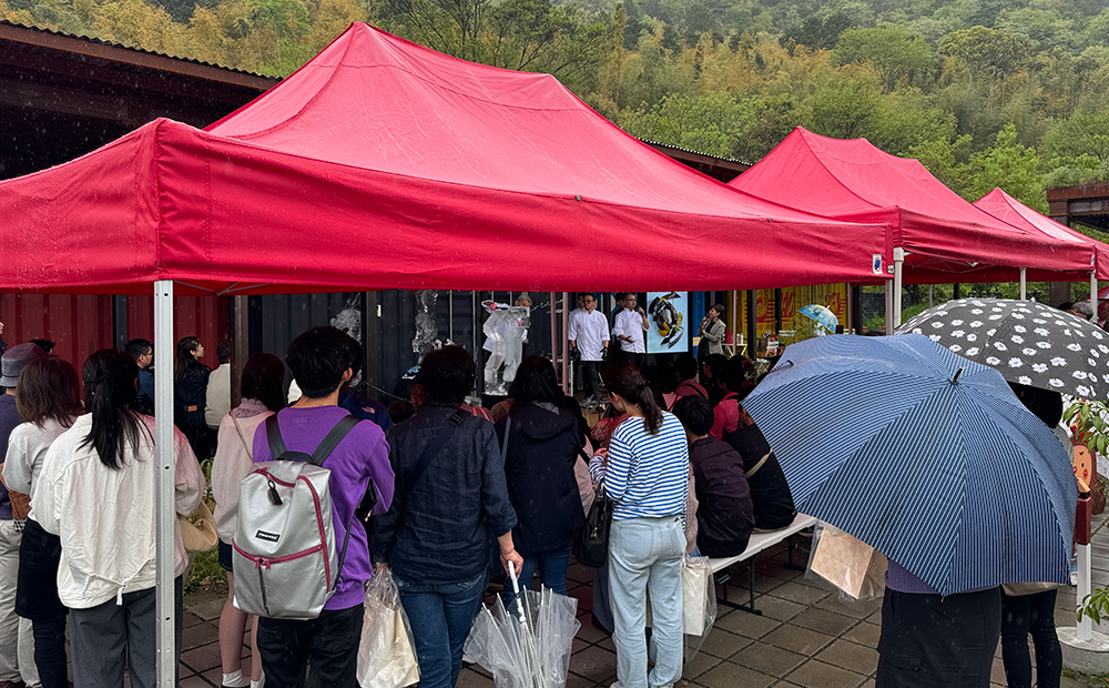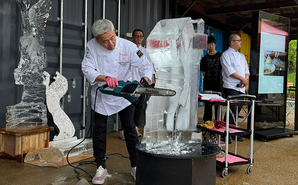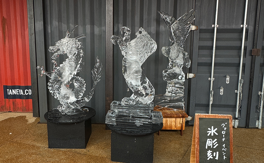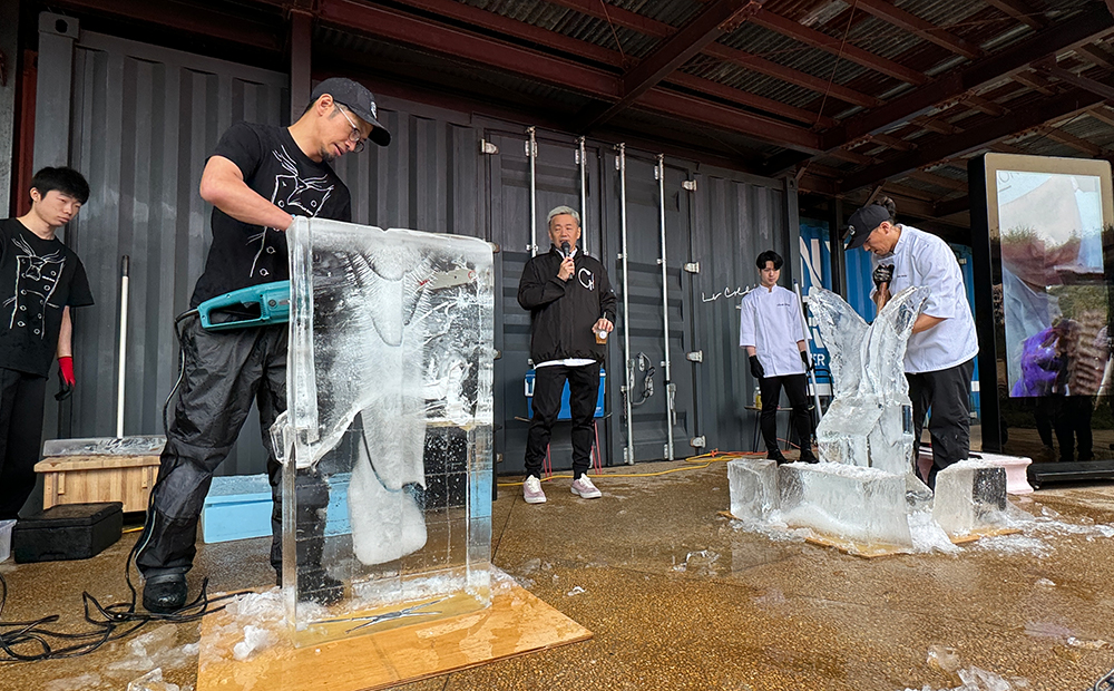 洋菓子の世界大会「クープ・デュ・モンド・ドゥ・ラ・パティスリー2017」準優勝のクラブハリエ グランシェフ 山本隆夫の氷彫刻とクラブハリエスタッフによる氷彫刻のデモンストレーションには、雨にもかかわらず多くのお客さまがお越しくださいました。