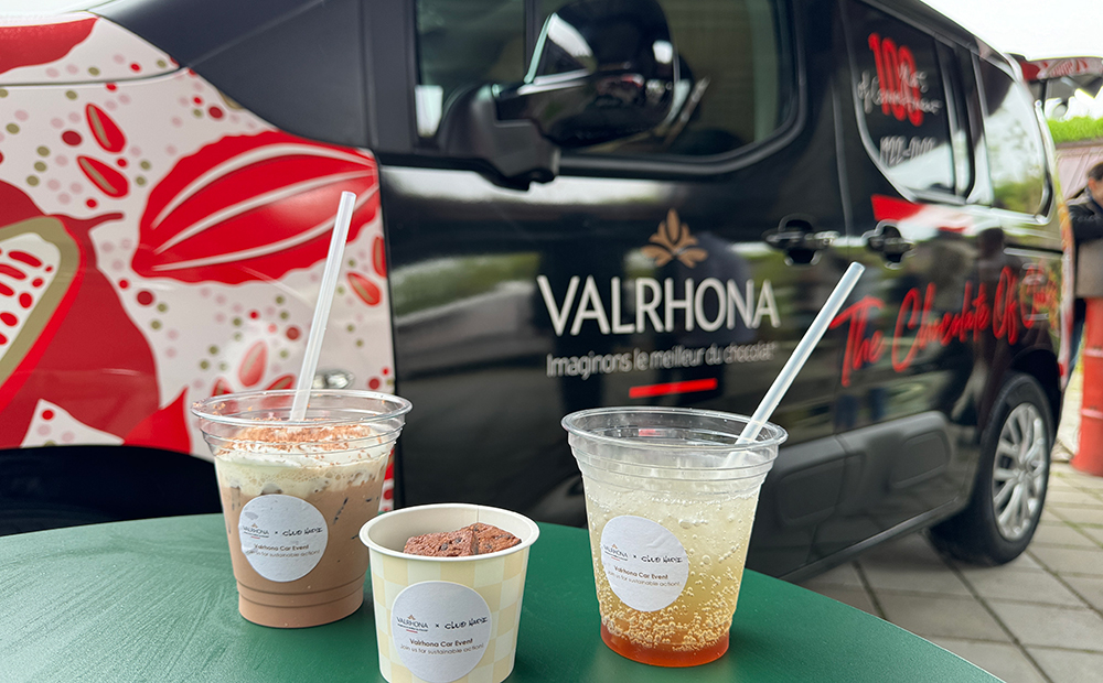 当日は「ヴァローナ」の濃縮カカオ果汁「オアビカ」と、ラ コリーナ産生姜を蜜漬けしたシロップを使ったジンジャーエール『オアビカジンジャー』、ヴァローナのミルクチョコレート「バイベ・ラクテ46%」を使用したショコラドリンクの『ショコラフロア』や、お菓子を作る過程でできる端材を生地に使った『サステナブルショコラクッキー』を限定販売しました。